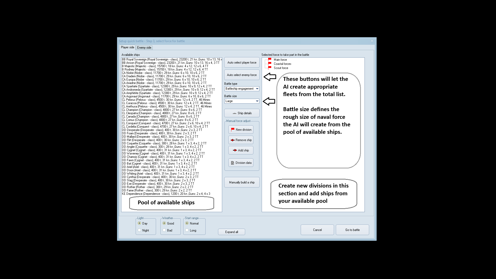 For those who prefer a short fight to a long campaign or just want to get right to the battle, the new Quick Battles system allows you to generate new battles from across the Rule the Waves 3 timeline, ranging from small skirmishes to full fleet battles and matching up balanced or unbalanced forces from very different periods.