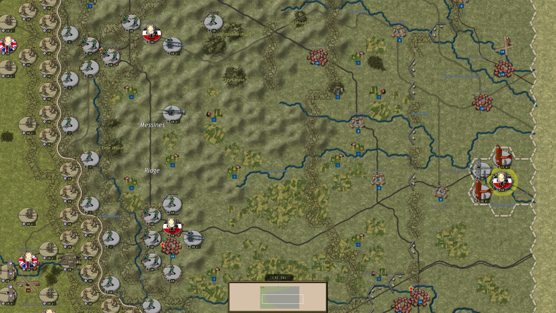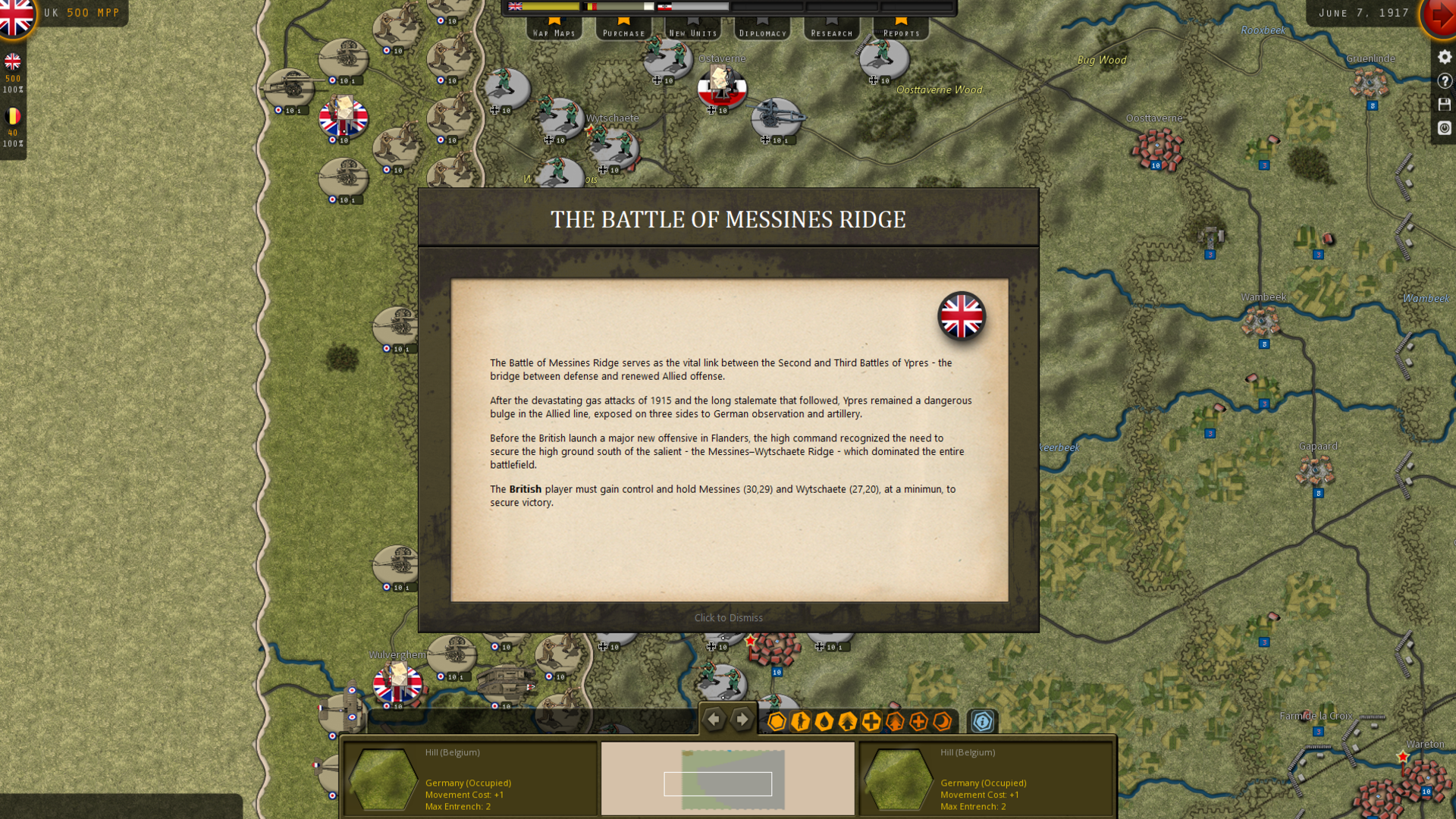 The British launch a decisive assault on the German salient south of Ypres, detonating massive underground mines and rolling creeping barrages forward. Players command multinational forces to seize the ridge, consolidate gains, and repel counterattacks before advancing further.