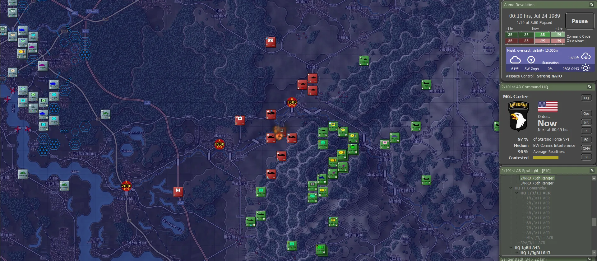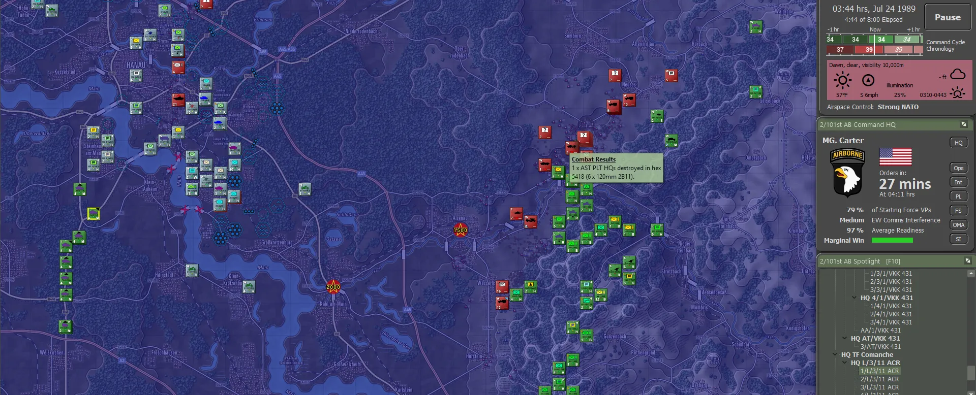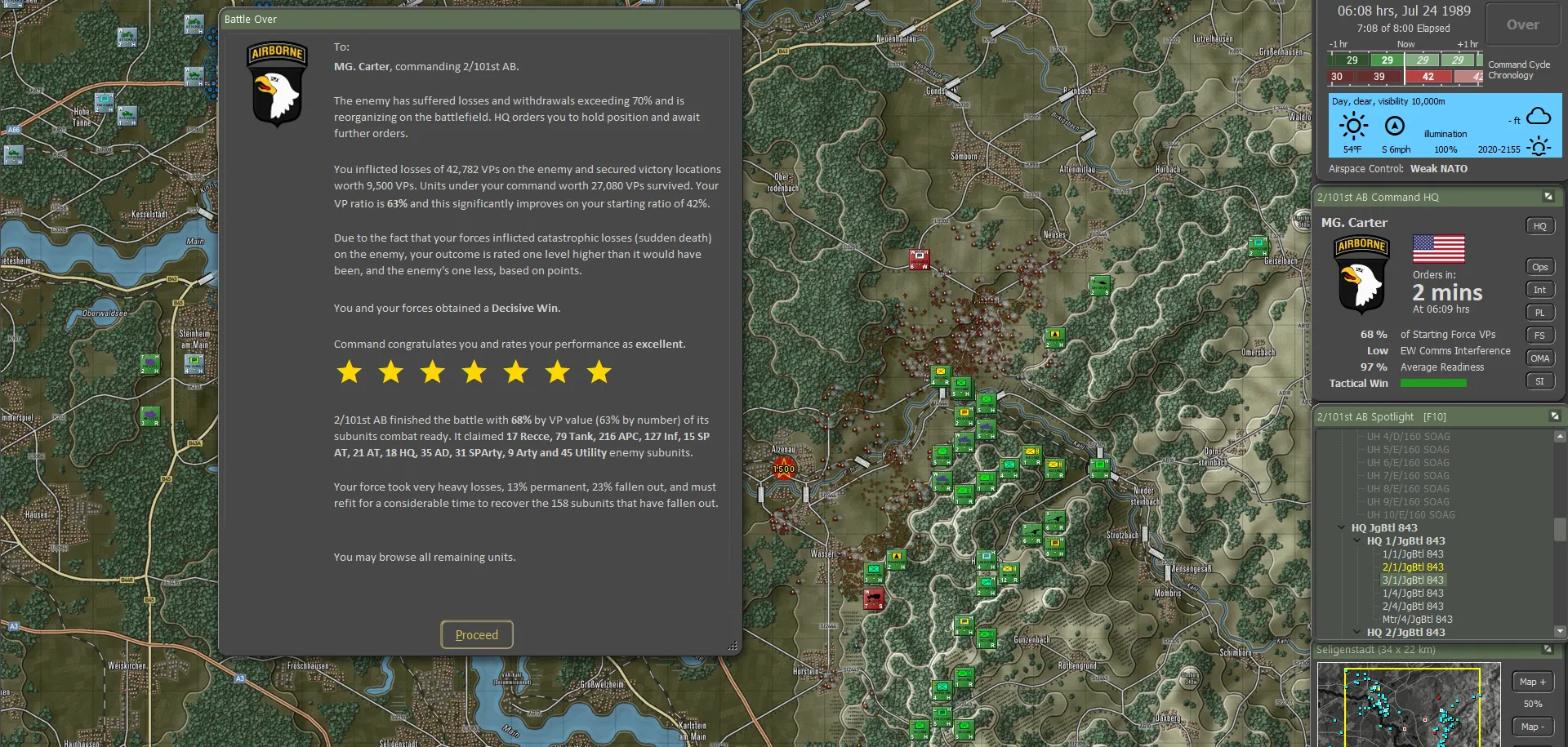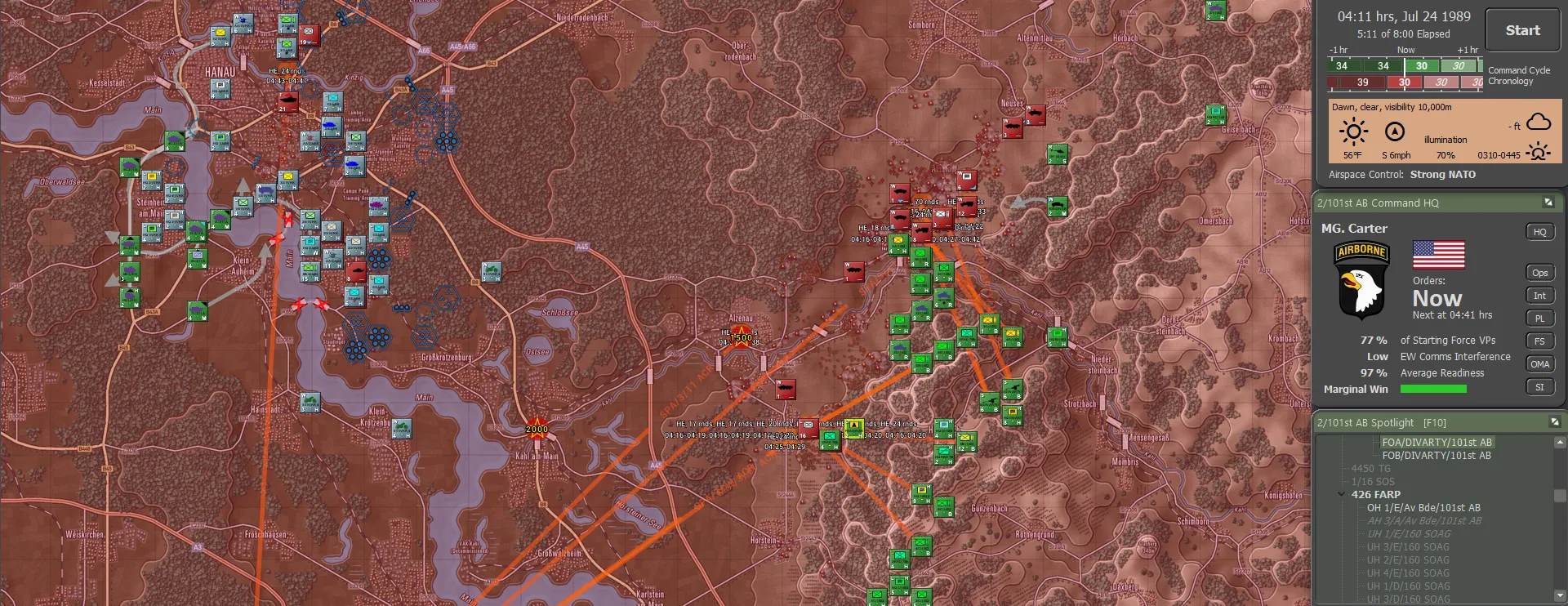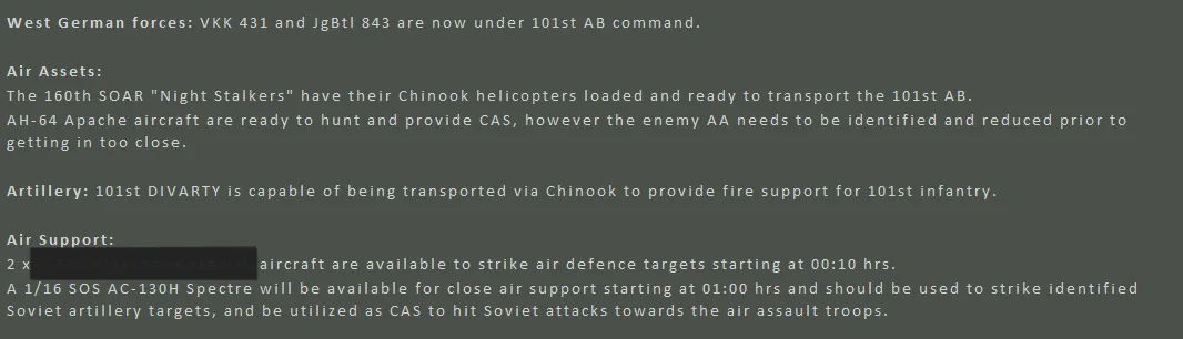 It turned out the Germans actually carried their fair share of the fighting, though this was not visible to the 101st. Between the two forces, including 56 Claims from the Apaches, 736 enemy sub-units had been accounted for, set against total sub-unit losses of 144. For NATO definitely not a gross result. And a brilliant day for the 101st!