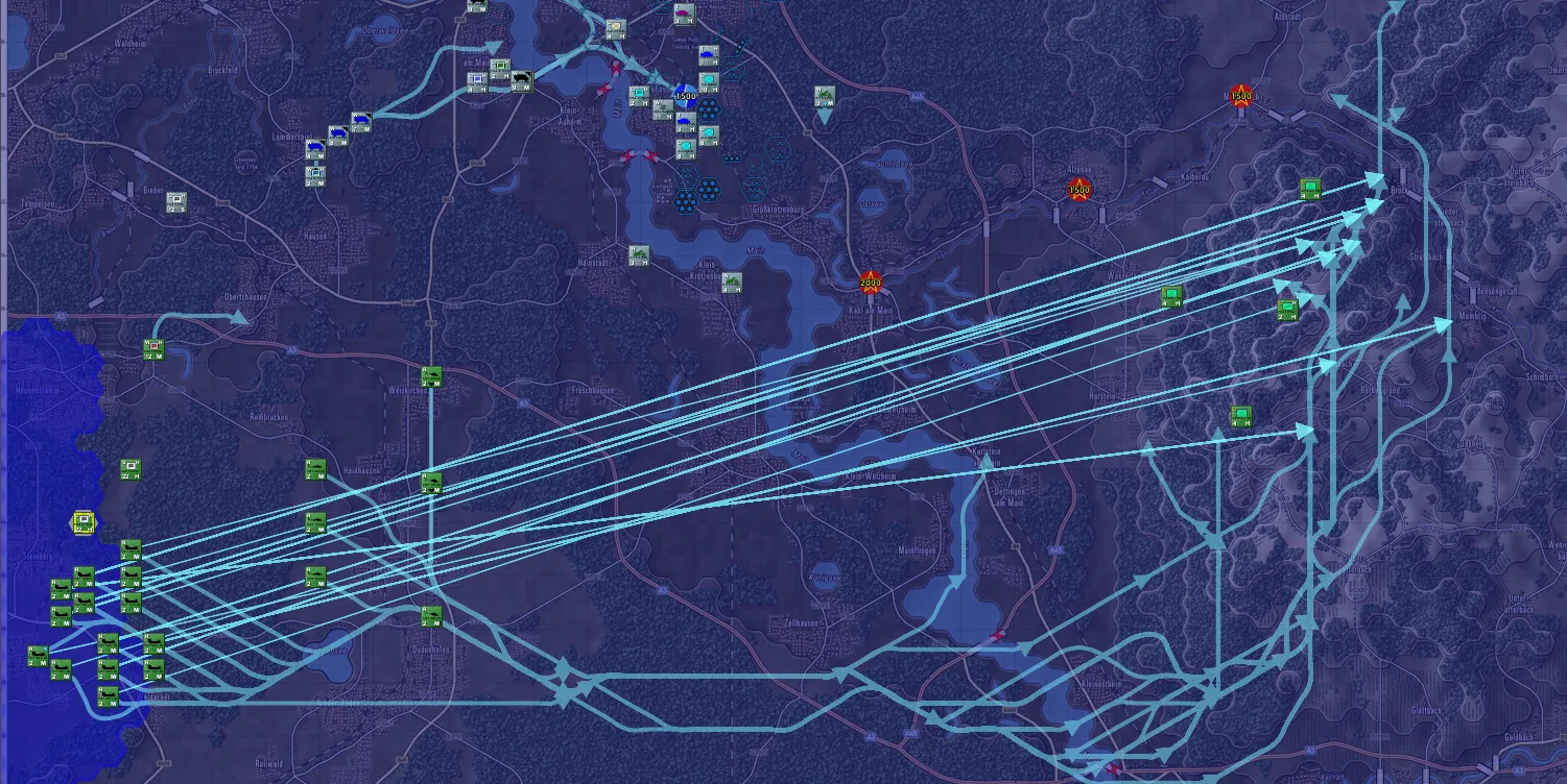 This, to put it bluntly, stunk. The Apaches couldn't take risks, and their AT Hummers were taking an even longer time to navigate into position than the troops. They could only use artillery, and watch as the tank battalion cruised through Michelbach and took up positions closer to the river.