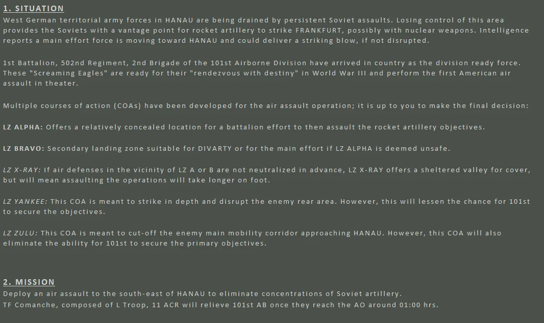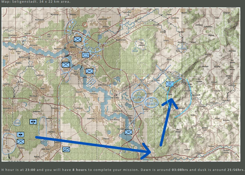 He wanted to use the Hemsbach Ridge as a redoubt and shield to protect his Chinook's on the way in. He could attack the high priority rocket batteries and interdict the arriving MRR if he could own that high-ground and occupy Michelbach. He drew his own route and LZ on the provided map and started giving orders. The men were told to eat and grab 4 hours of rest however they could, loading would begin at 2200; the 101st specialized in night actions and there was no way they could wait 24 hours.