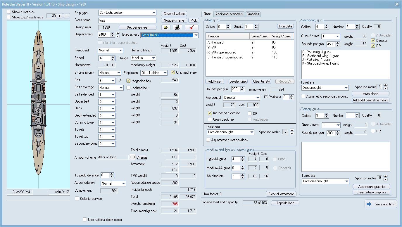 When a ship is designed, the year of the ship design can be set, which means that the ship will have the technologies and attributes appropriate for that time and nation. For example, the armor quality and engine development level of the ship will be saved along with the design and used for various functions when the ship is in battle.
