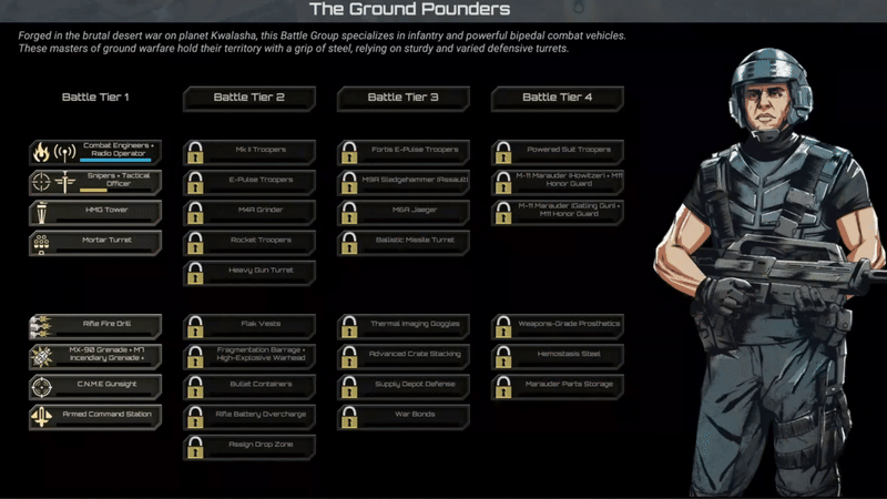 As part of the base game, all players have access to the “Ground Pounders” Battle Group. Each of the current DLCs includes its own Battle Group, which features units from their respective campaigns alongside some units from the base game.