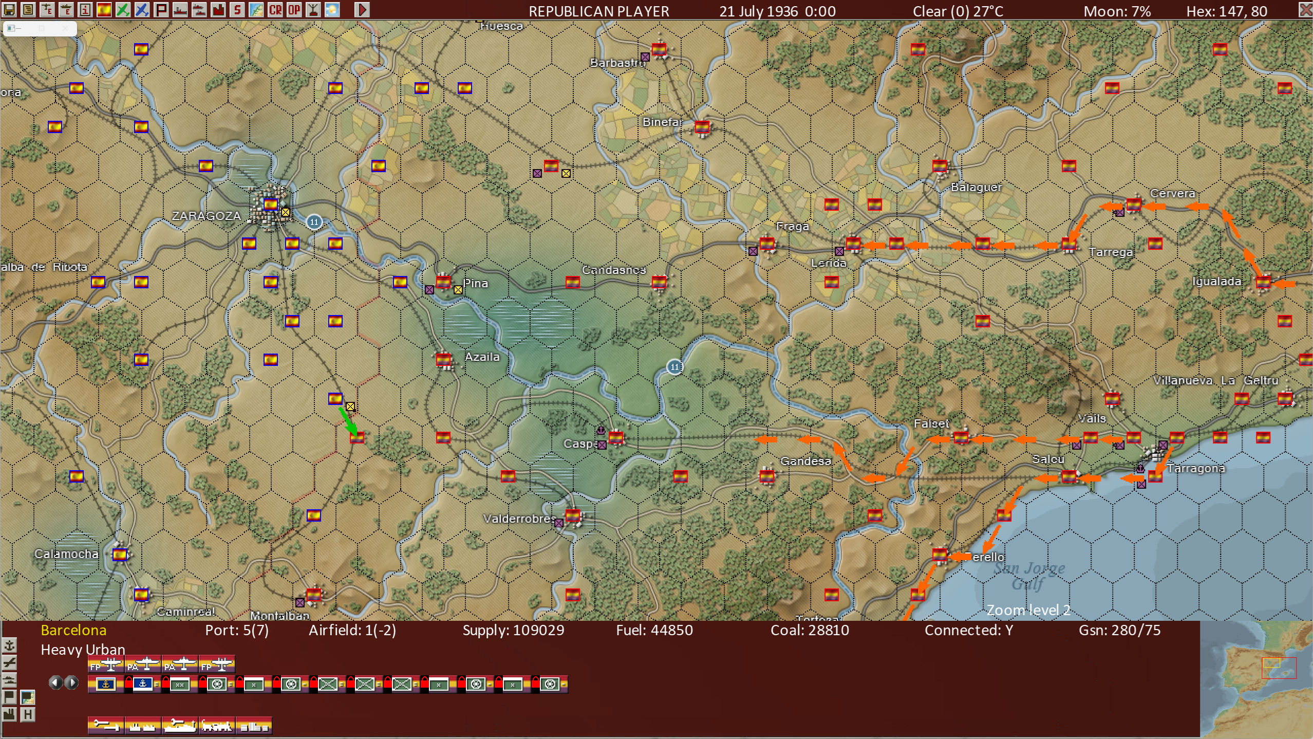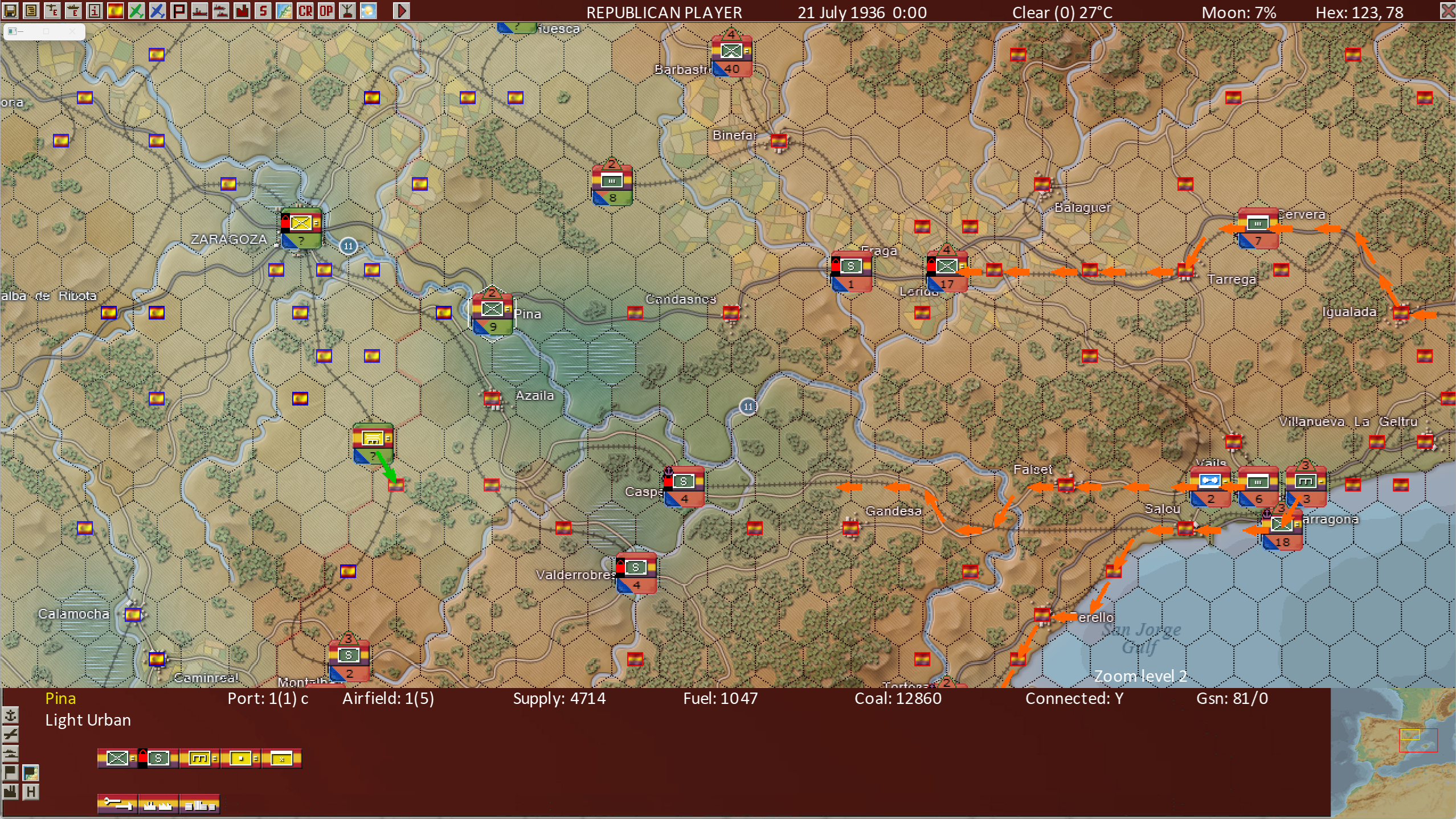Both War In Spain 1936-39and War in the Pacific - Admiral’s Edition are “dual occupancy: hex games, meaning it is normal for units from both sides to be in the same hex, whereas games like War in the East 2 are “single occupancy” meaning normally only units from one side or the other may be in the hex. Hence above you see in the town of “Pina” near the center of the above screen shot, units from both sides are in the hex. This legacy view shows unit counters from both sides (purple and yellow) in the Pina hex.