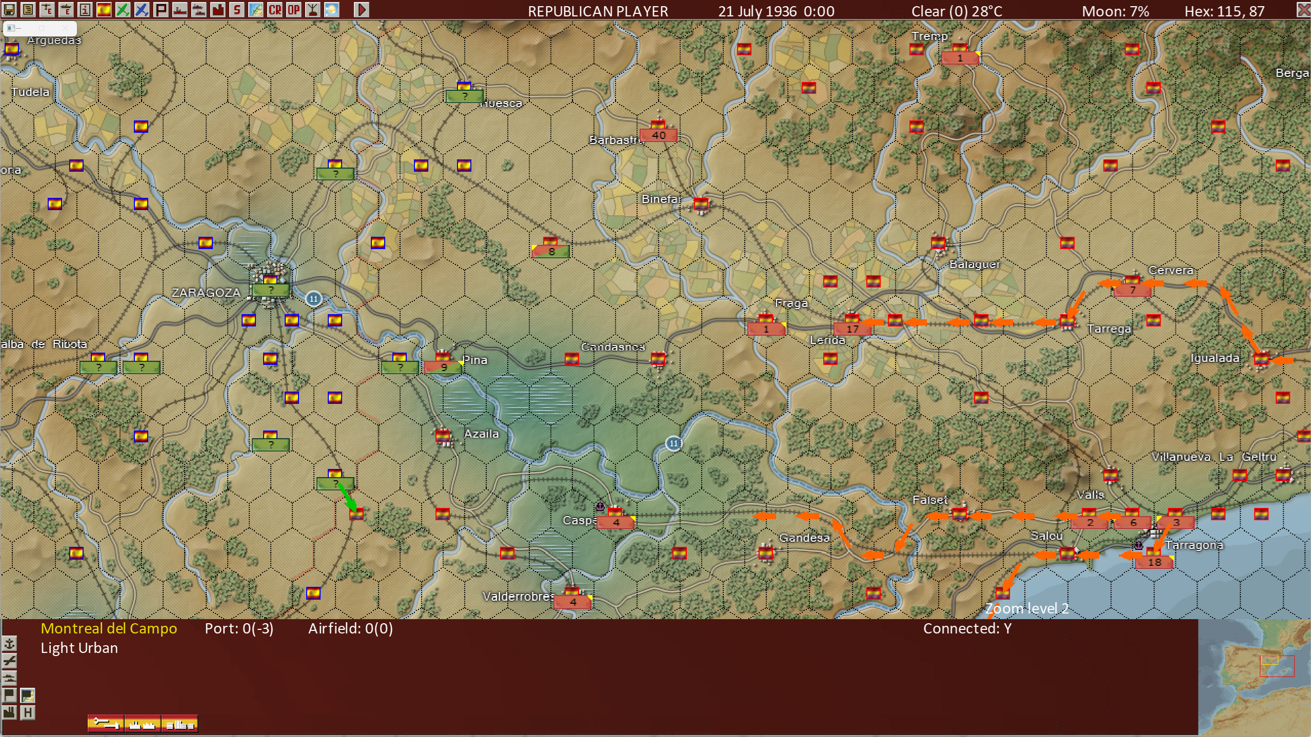 The brick red rectangles are for the Republicans, the Green for the Nationalists. At Pina, which has units from both sides, we see both colors in diagonal areas of the rectangle. The number in the rectangle at Pina is the estimate of the friendly Assault Value.