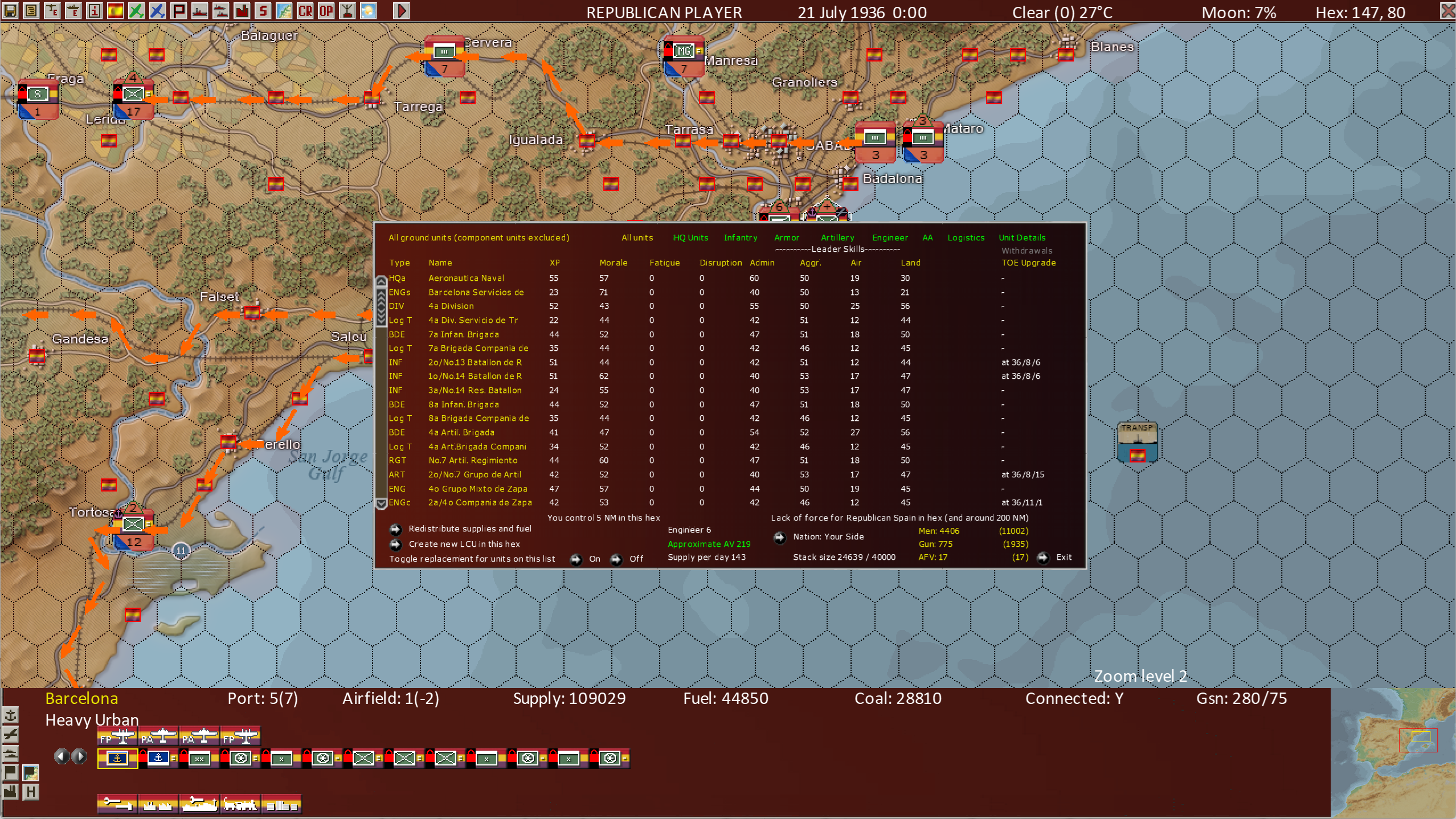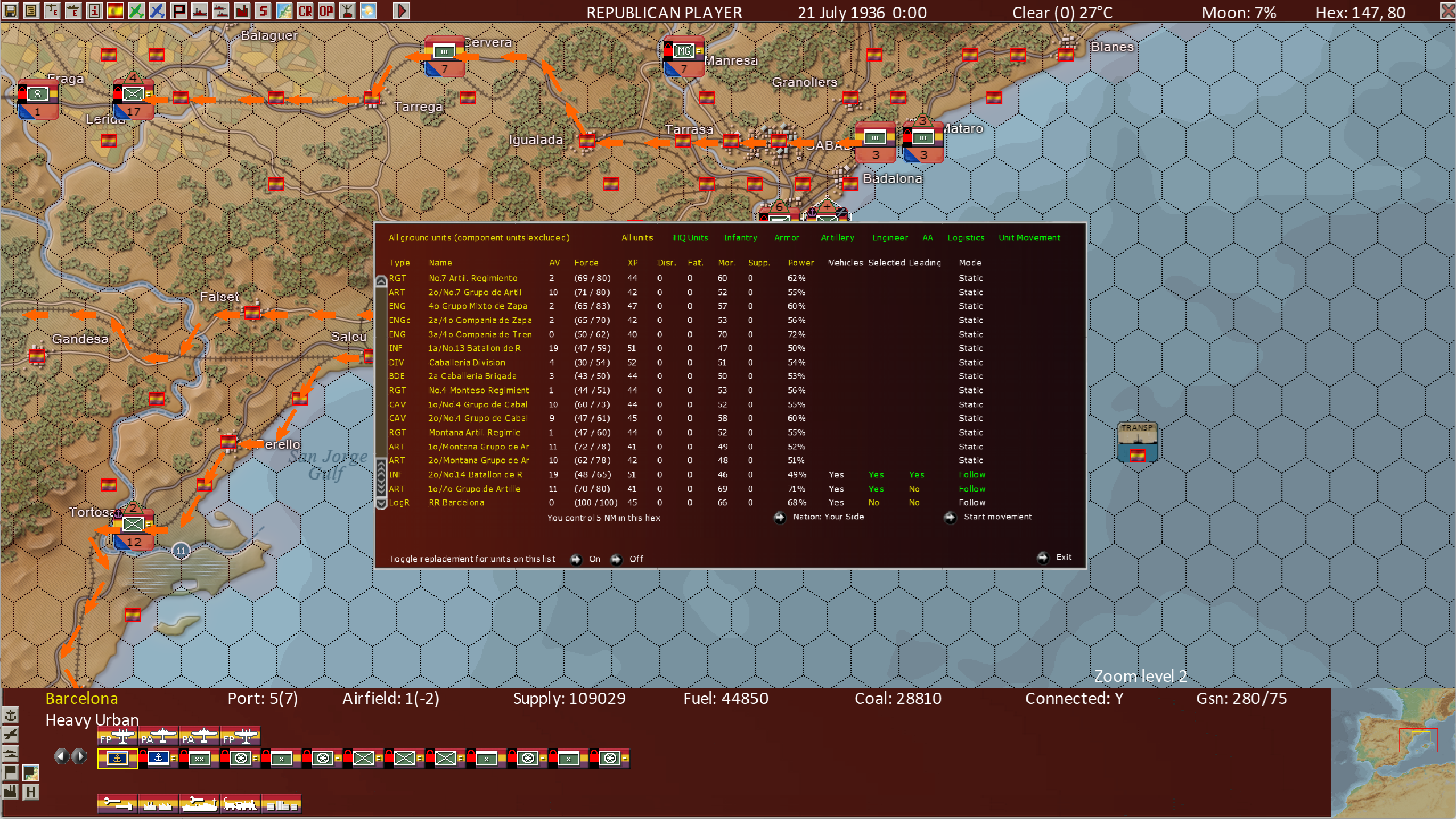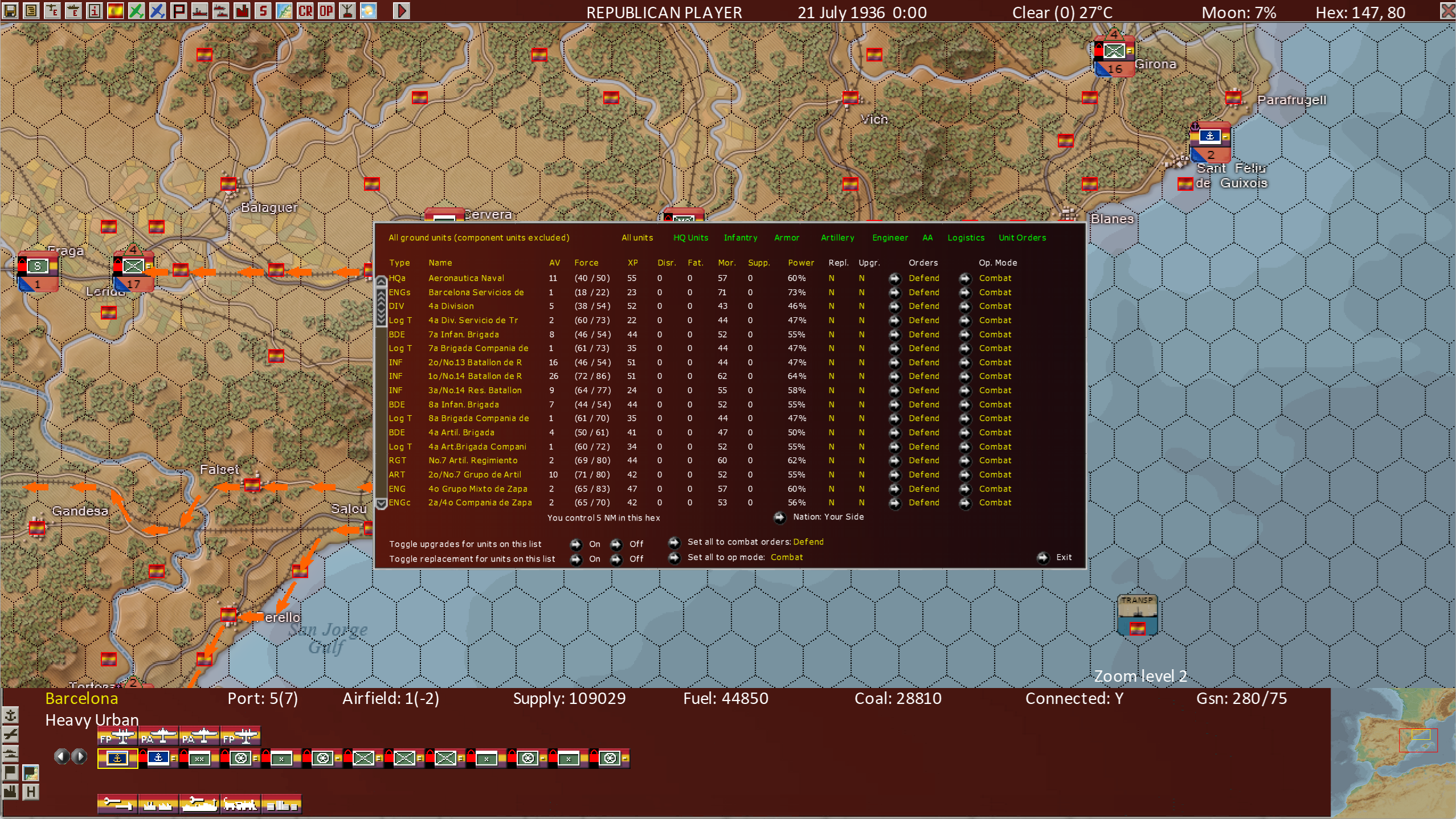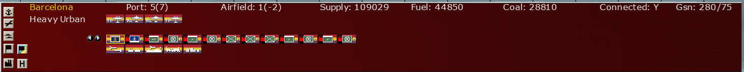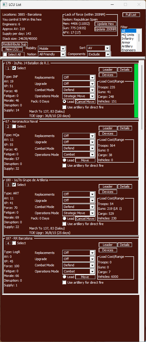 These 4 list screens are most useful when working in hexes with many units in the hex. Barcelona is a key city and will often have 20+ units in it. The list views enable the player to see more units at a time than other views, improving their ability to control large numbers of units.
