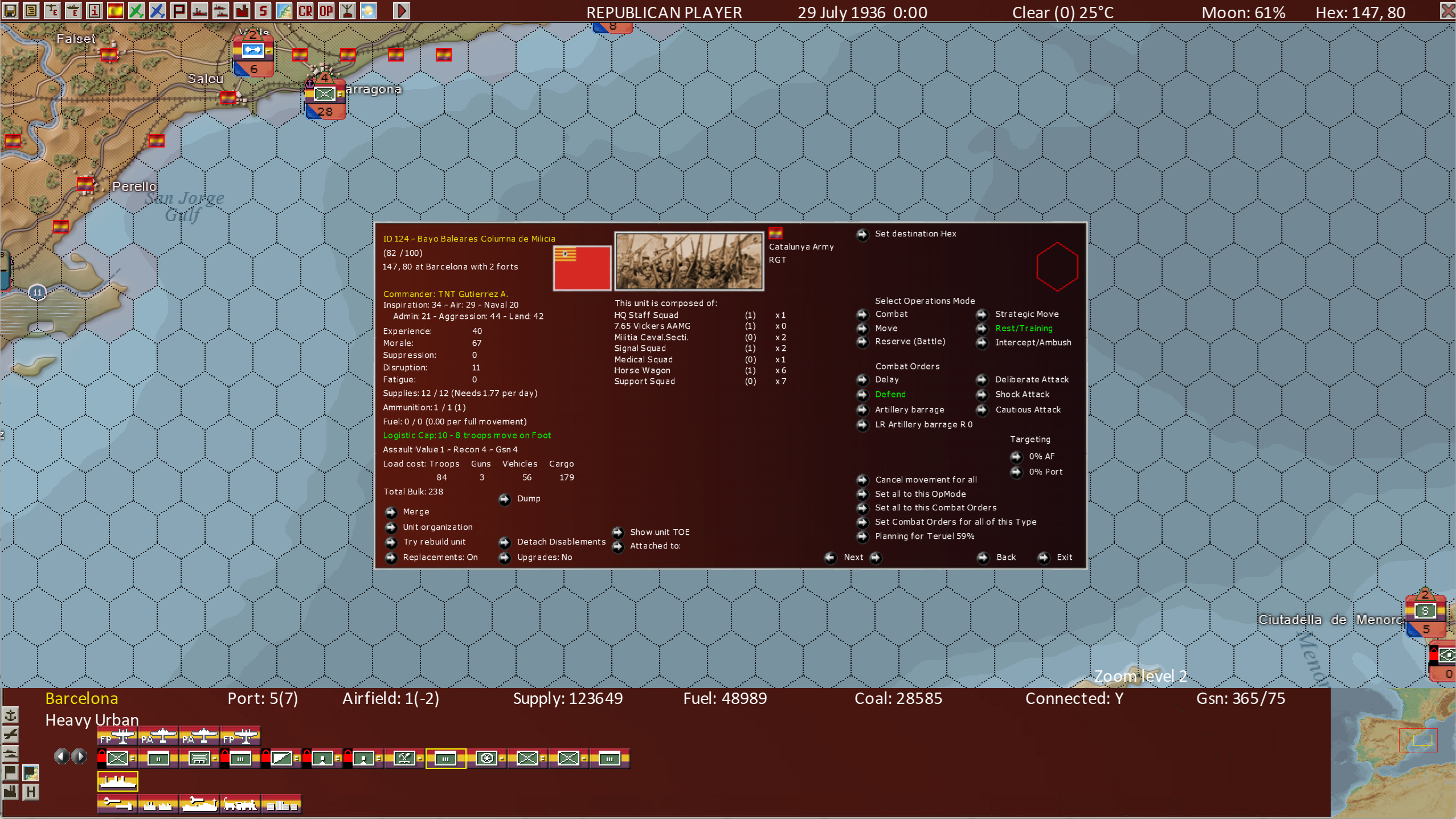 This shows that we have now “built up” the Bayo Baleares Columna de Milicia unit, to include all its component units present in Barcelona. And if we now move this larger unit (now a single unit on the map) to Teruel, where we noticed its artillery unit is located, we can add the artillery unit to this high-level unit as well.