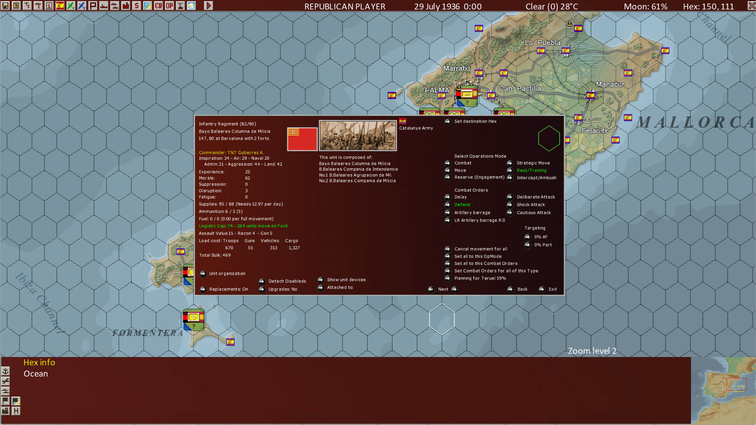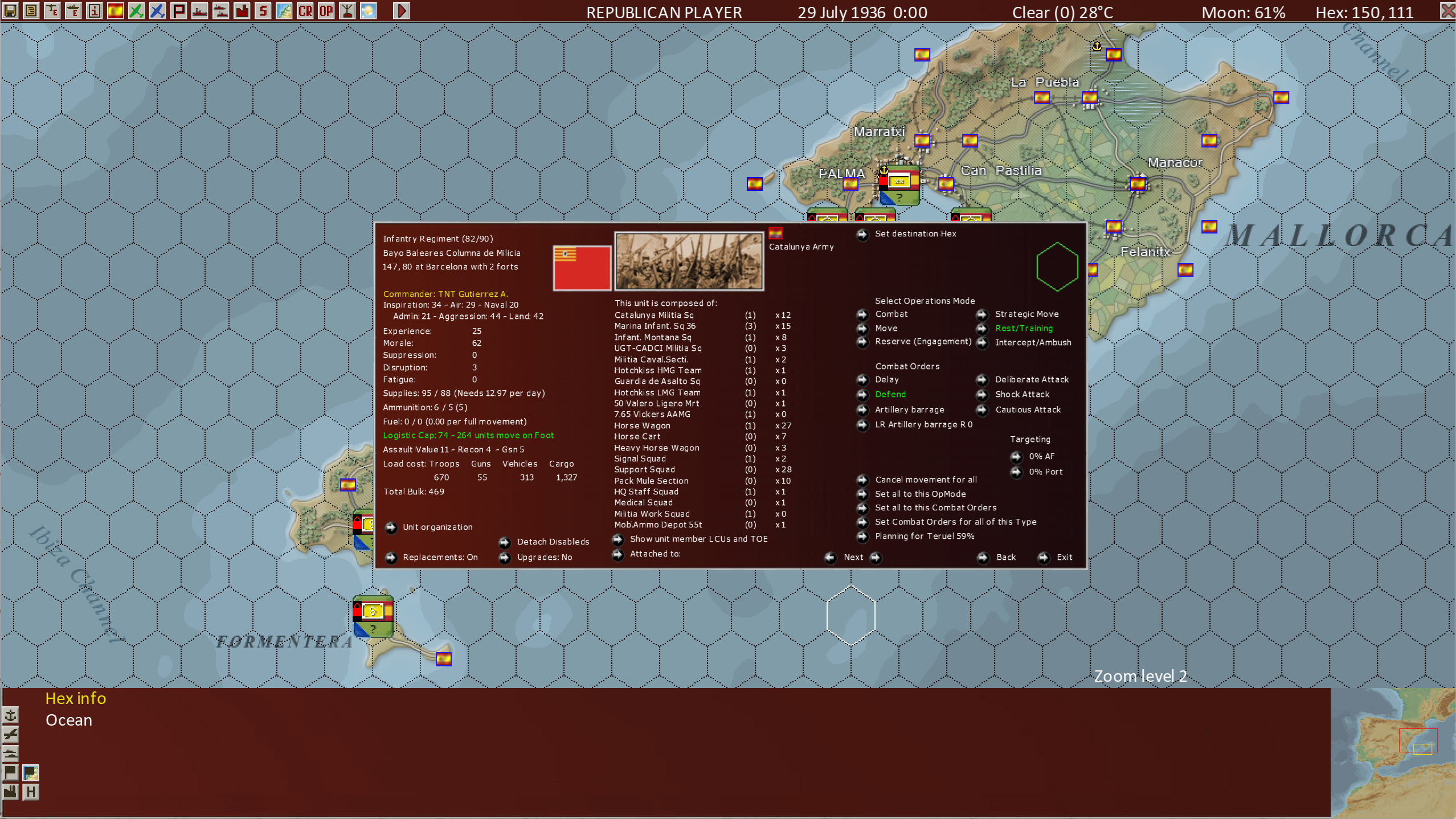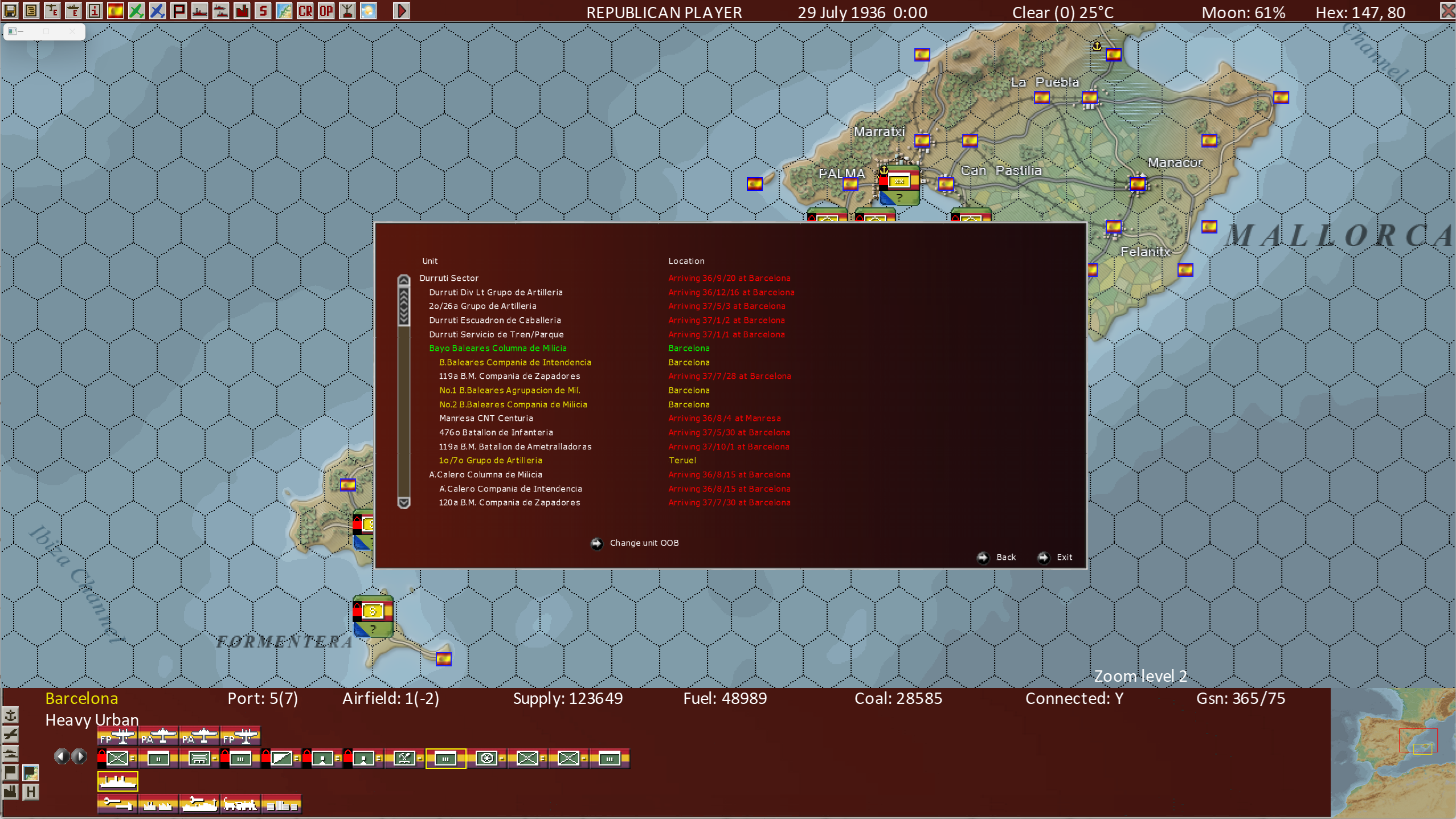 This view shows us the entire Order of Battle of the parent unit, the Durruti Sector and the Bayo Baleares Columna de Milicia subordinate units’ Order of Battle as well, as well as which units are on the map and their locations.